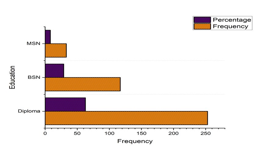 The sample included RNs who were employed in a tertiary hospital, district hospital, private clinic, and community health center in Northeastern Pakistan. The student nurses, post RN nurses and diploma-nurse graduates were not included to give similar clinical experience and training.